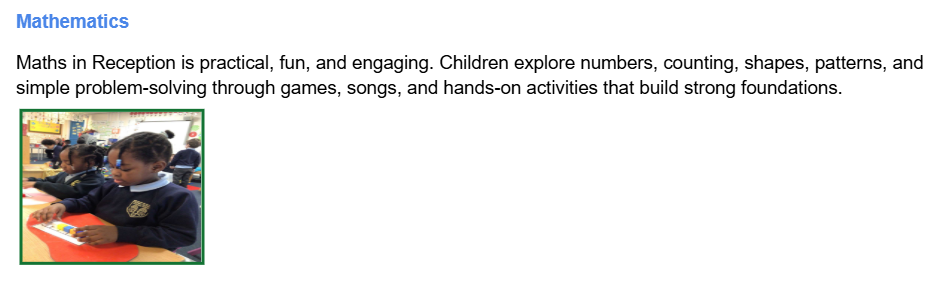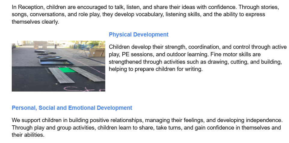 In Reception, children are encouraged to talk, listen, and share their ideas with confidence. Through stories, songs, conversations, and role play, they develop vocabulary, listening skills, and the ability to express themselves clearly.